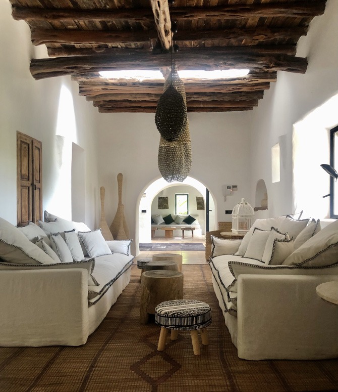 Dans cette ancienne ferme construite en 1950, on retrouve tous les codes de l’architecture typique de l’île. Murs épais blanchis à la chaux, plafonds en sabine, piliers de pergola là-dessus un toits terrasse.