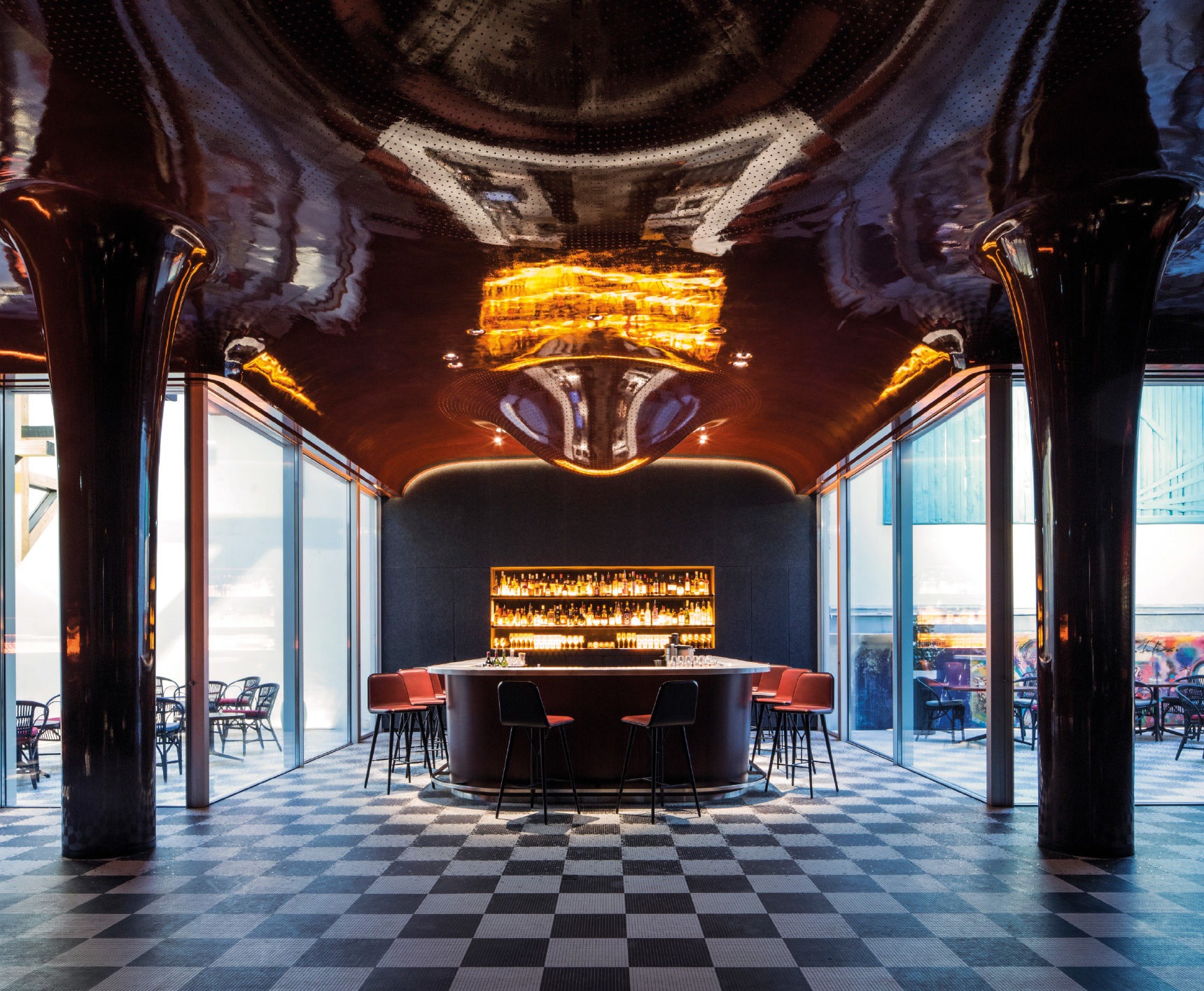 Shining. Mick Jagger, Jean-Michel Basquiat, Andy Warhol, Roman Polanski, Djemila Khelfa… Temple de la branchitude parisienne des années 80, l’ex boîte de nuit des Bains Douches a rouvert ses portes en 2015 pour accueillir désormais un hôtel-restaurant et refaire de l’œil aux noctambules de la capitale. Qui peuvent désaltérer au Roxo Bar toutes leurs envies mixomaniaques. Au sol, un trouble damier noir et blanc pixélisé. Au plafond, des perles de gouttes d’eau de taille XXL, figées dans une laque écarlate (obtenue après sept passages de vernis). Ses arabesques sanguines coulent jusque sur les colonnes et le chapiteau évasé. Au centre, un bar en lave émaillée, sanglé dans une ceinture de chêne, couleur acajou. Une mise en scène orchestrée par l’architecte Denis Montel (RDAI).